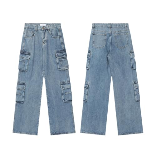 HOT ! Women's Casual Loose Straight-Leg Jeans, Men and Women streetweer Style Hip-hop Workwear, Multi-Pocket Blue Pants