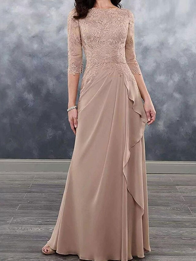 Dress Mother of the Bride Dress Wedding Guest Elegant Simple Crew Neck Floor Length Polyester 3/4 Length Sleeve with Lace Solid Color 4