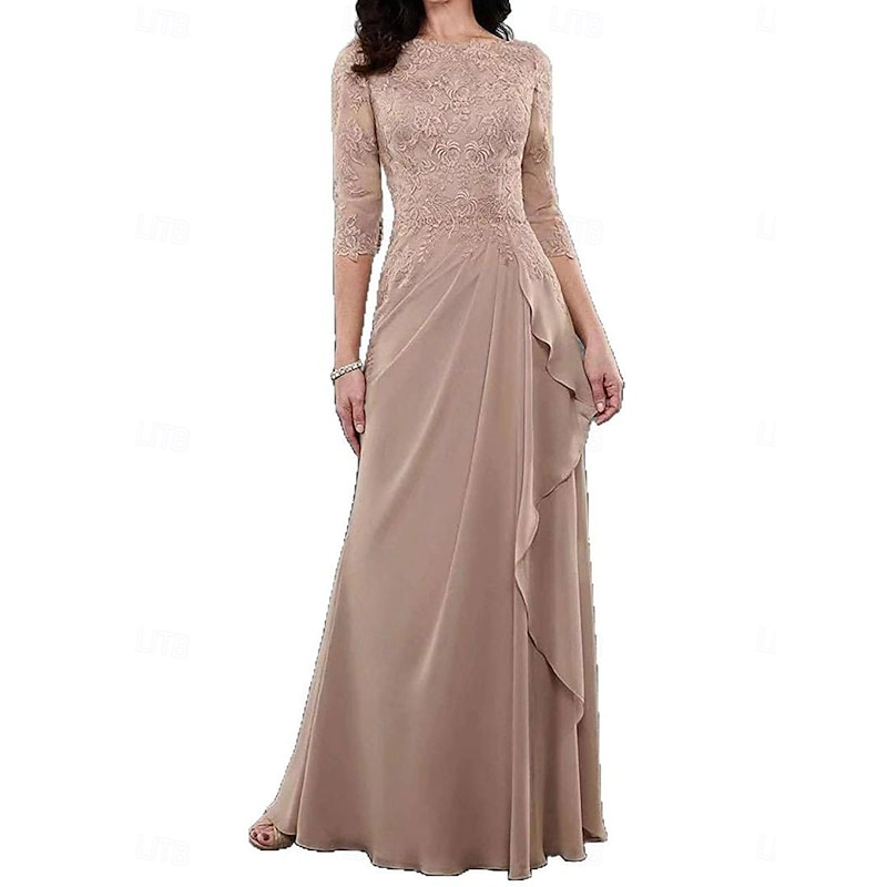 Dress Mother of the Bride Dress Wedding Guest Elegant Simple Crew Neck Floor Length Polyester 3/4 Length Sleeve with Lace Solid Color 1
