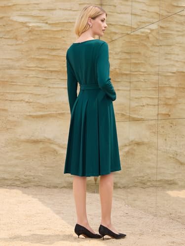 Women's Pleated Dress Long Sleeve Crew Neck Tie Waist Business Work A Line Dresses 4