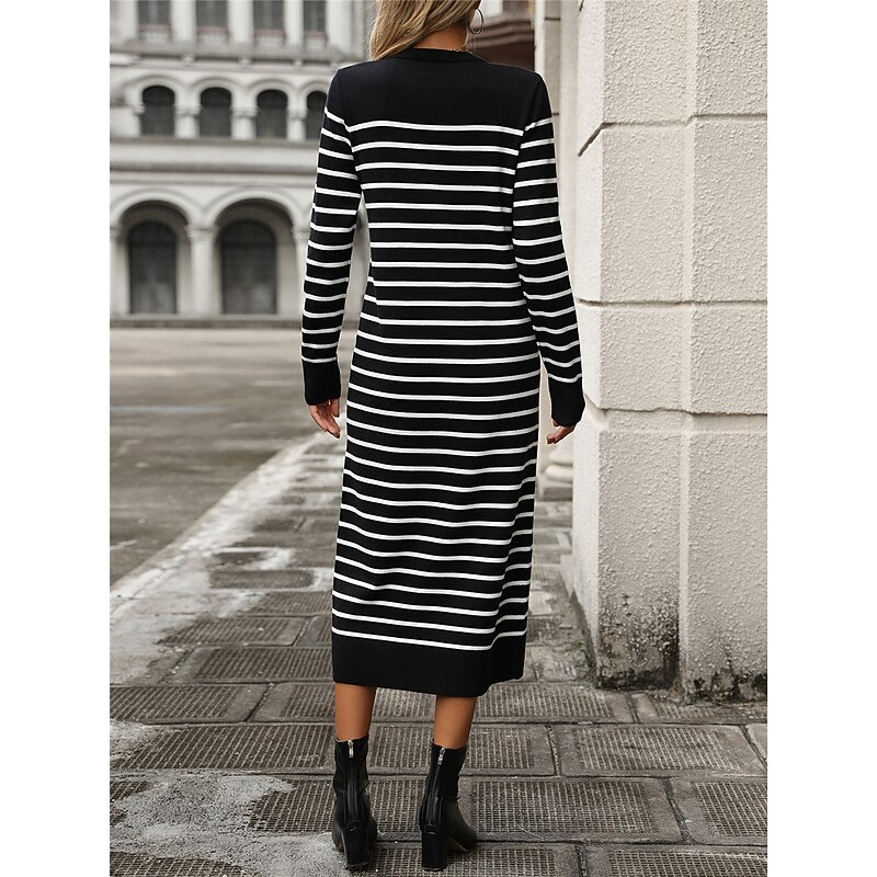 HOT ! Women's Sweater Sweater Dress Casual Soft Striped Ribbed Crew Neck Knitted Long Sleeve Long Tops Knit Outdoor Daily Weekend Black White Fall Winter