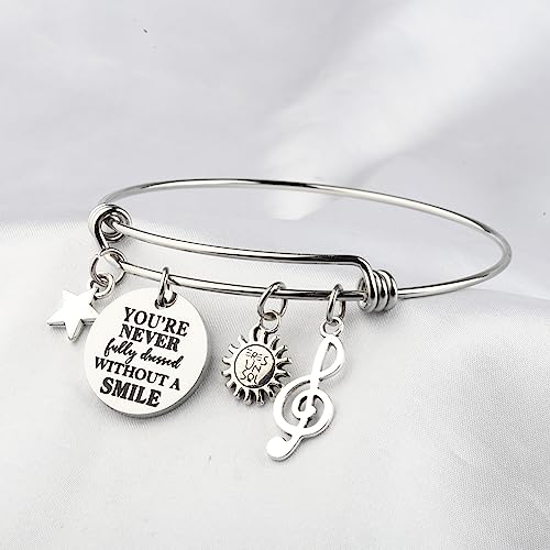• Musical theater jewelry---The Bangle Engraved with“You're Never Fully Dressed Without a Smile”. If you love to go to Musical Theater, this bracelet is the best way to express your love for musicals.