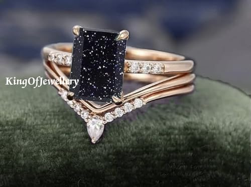 K O J Emerald Cut Blue Sandstone Engagement/Wedding Ring+Bands, Dainty Cz Ring Set of 3, Anniversary Ring, Bridal Ring, Vintage Ring, Best Gift For Her, Sterling Silver Ring, Stacking Ring 4