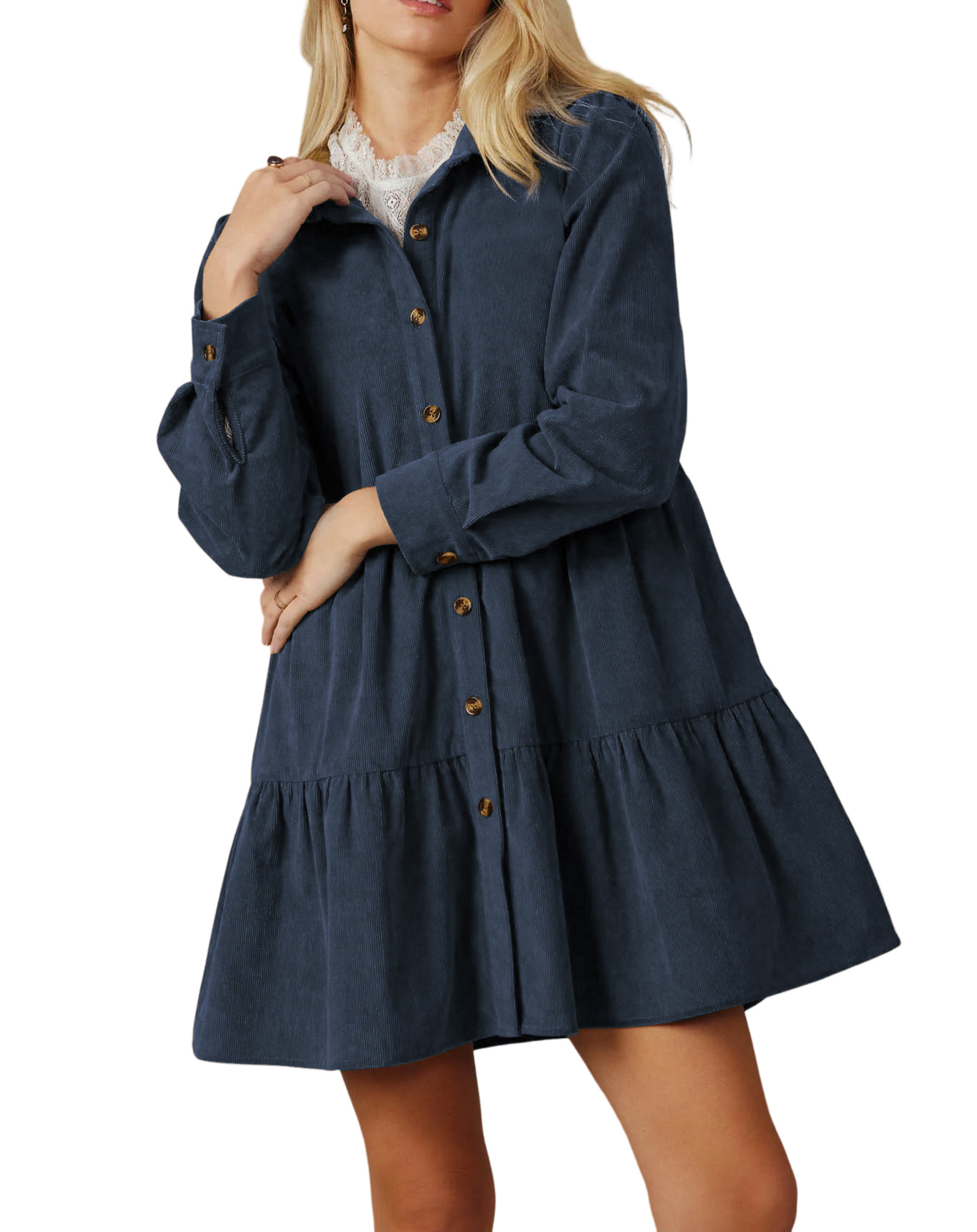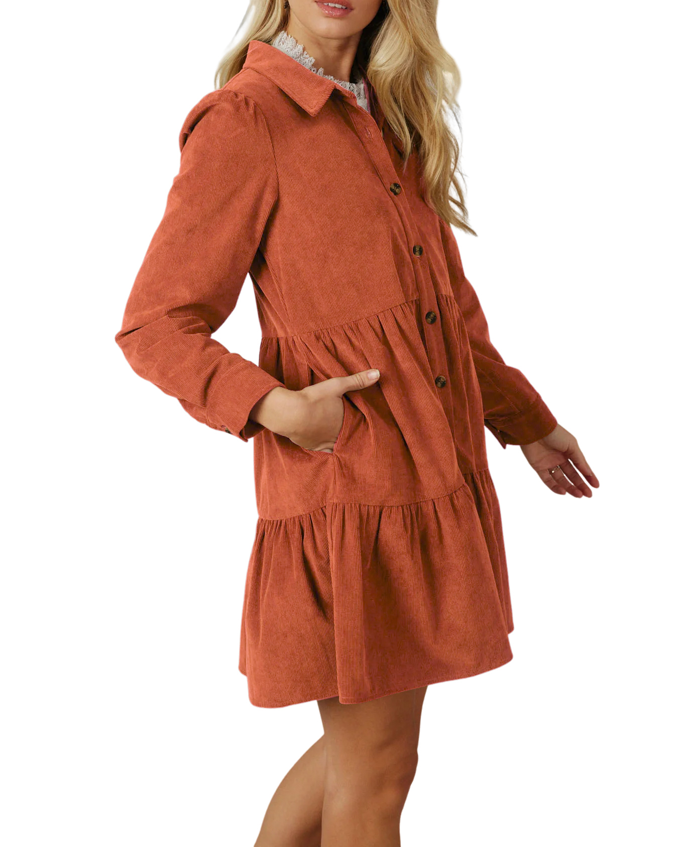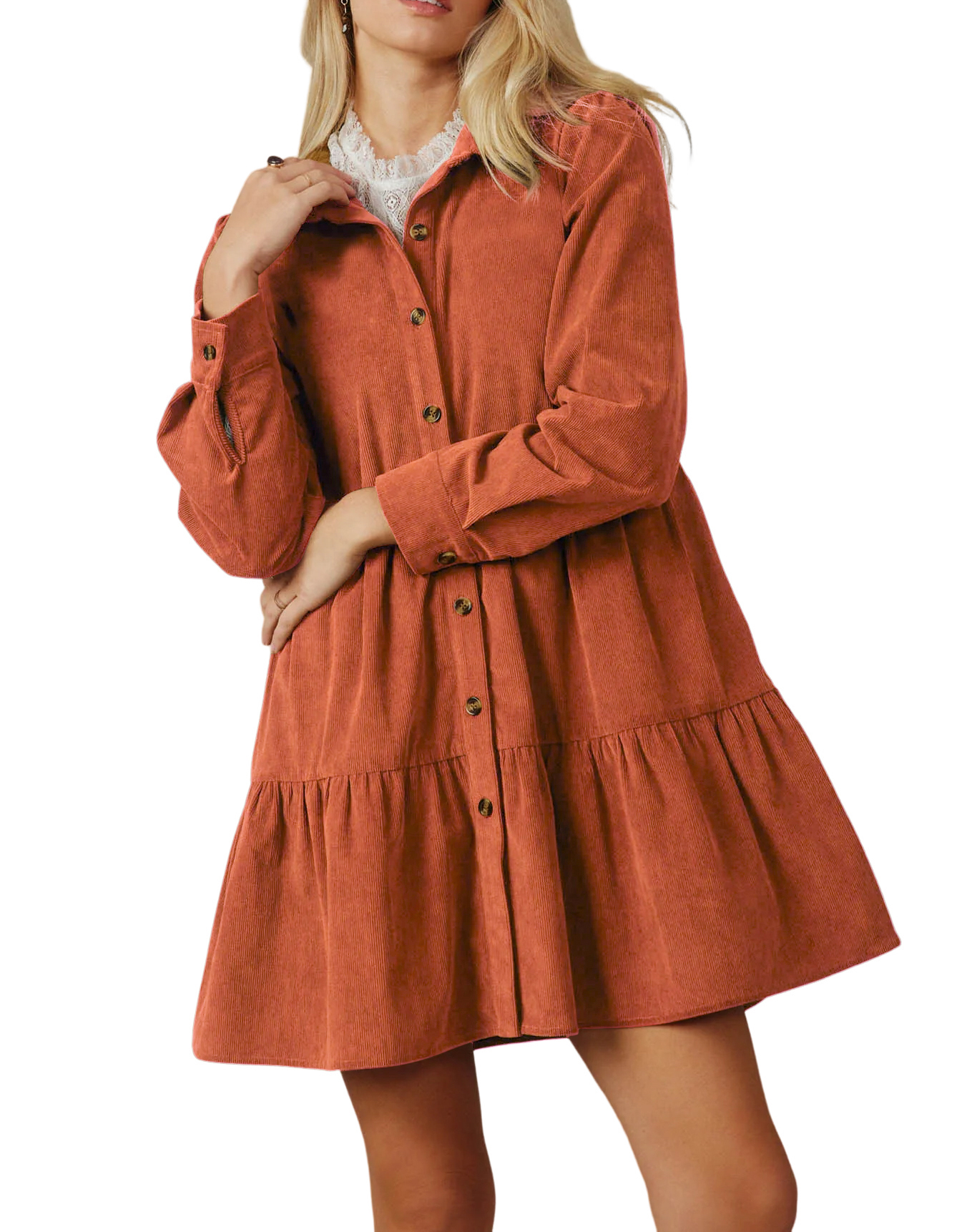 R.Vivimos Womens Fall Corduroy Dress 2024 Long Sleeve Button Down Tunic Mini Babydoll Dress with Pockets 11