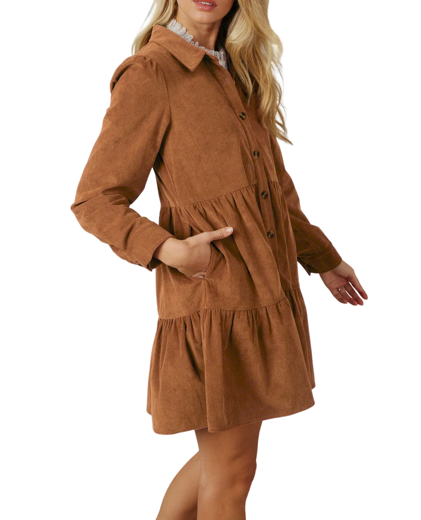 R.Vivimos Womens Fall Corduroy Dress 2024 Long Sleeve Button Down Tunic Mini Babydoll Dress with Pockets 5