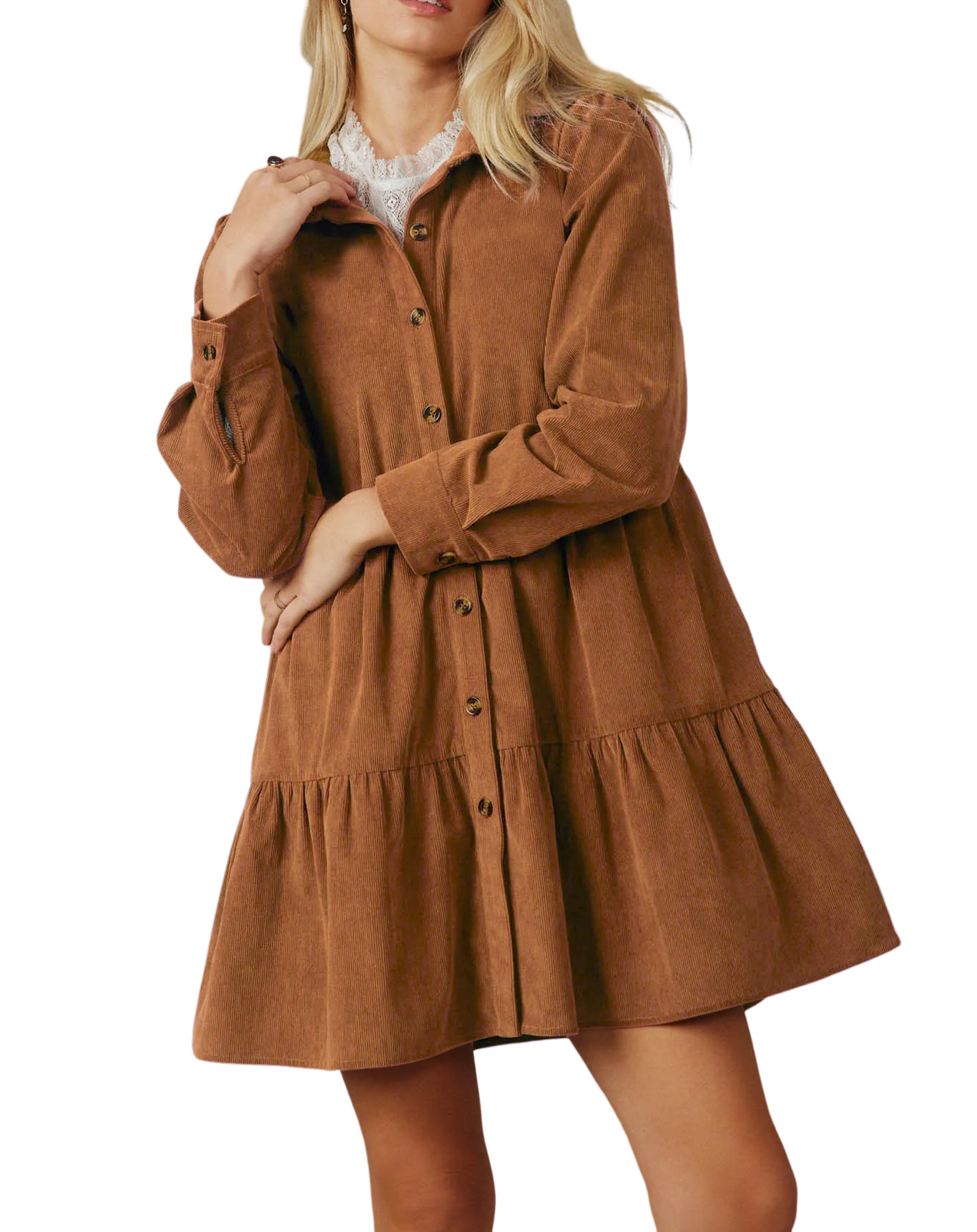 R.Vivimos Womens Fall Corduroy Dress 2024 Long Sleeve Button Down Tunic Mini Babydoll Dress with Pockets 12