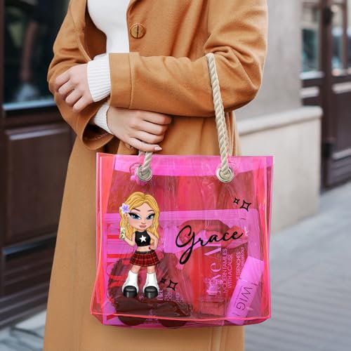 HOT ! Personalized Clear Tote Bag Waterproof Y2K PVC with Rope Handles Custom Cartoon Character and Name on Neon Clear Beach Bag- Birthday Concert Bridal Party Gift for Women