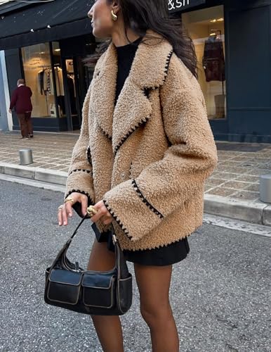 • Casual sherpa jacket with pockets, featuring contrast color scalloped embroidery edge, classic notch lapel, front invisible doube breasted button down closure, long sleeve with drop shoulder, 2 flap hand pockets; Khaki/ black/ rose pink/ apricot available