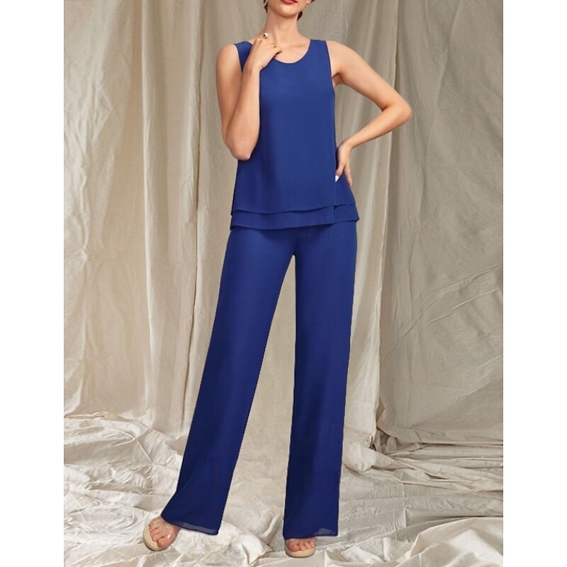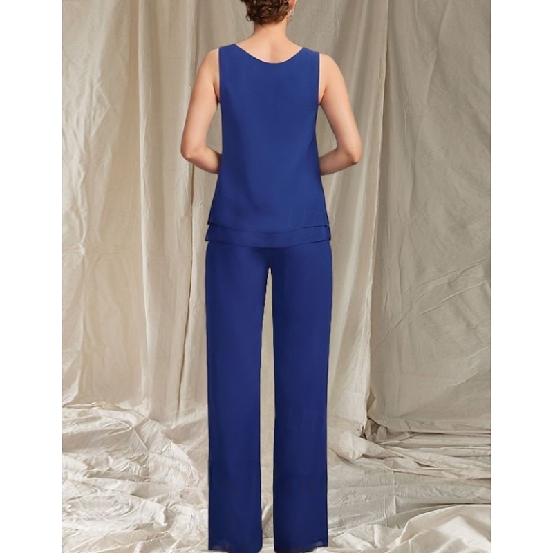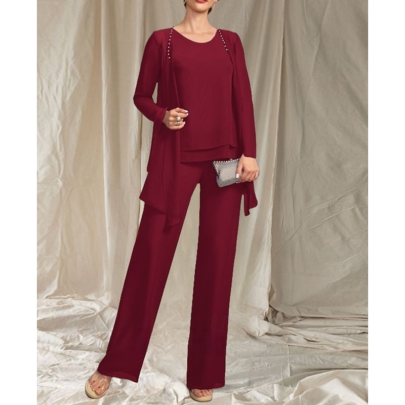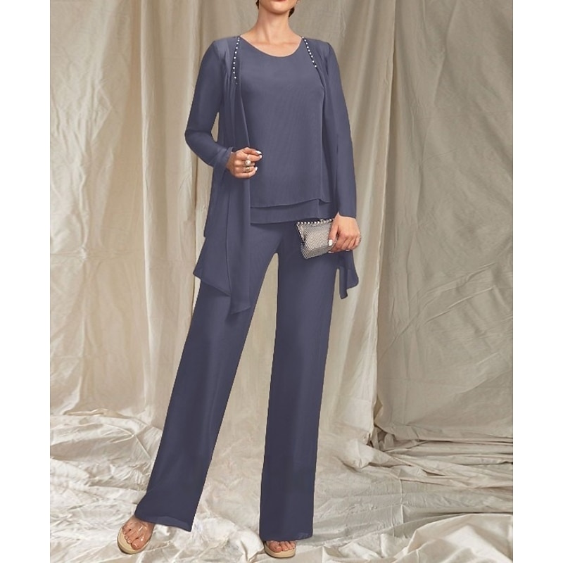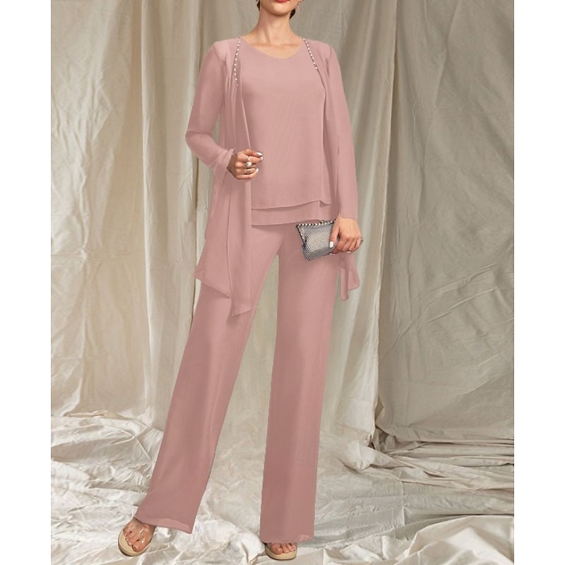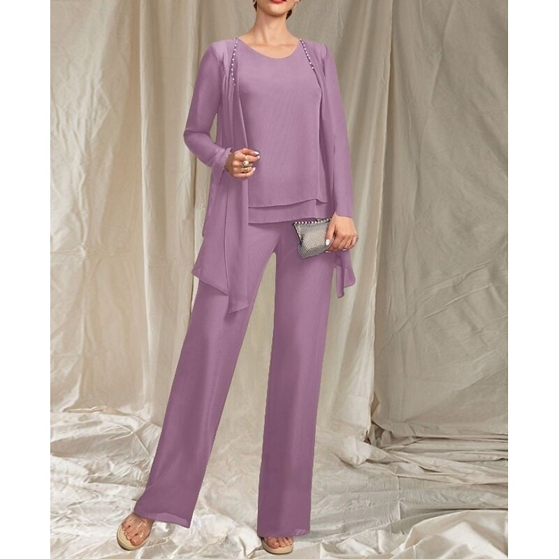 More information about Pantsuit 3 Piece Mother of the Bride Dress Wedding Guest Elegant Crew Neck Floor Length Chiffon Long Sleeve with Beading