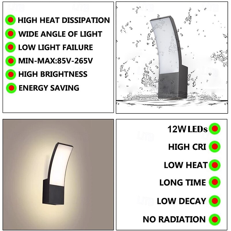 LED Outdoor Wall Light 12W Arc Modern Outdoor Wall Light Waterproof IP65 Steady on Outdoor Black Wall Light Suitable for Outdoor Porch Courtyard Garden Bathroom Bedroom 85-265V 16