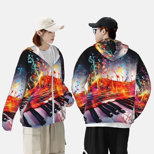 HOT ! Men's UPF 50+ Sun Protection Hoodie Colorful Piano Keyboard Music Note Long Sleeve Sun Shirts Full Zip Light Fishing Jacket