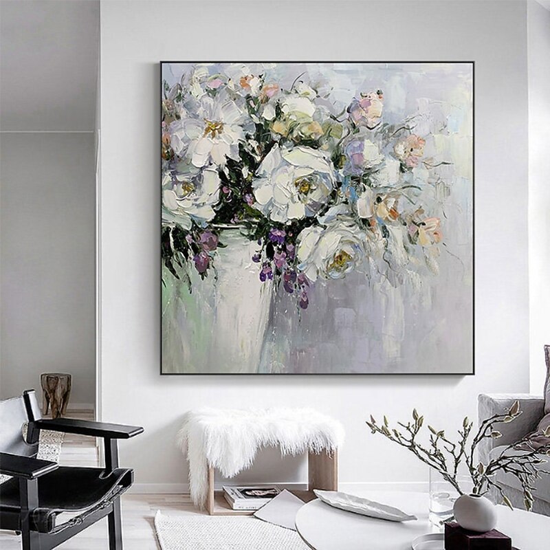 HOT ! Handmade Oil Painting Canvas Wall Art Decoration Abstract Floral Painting White Peonies for Home Decor Rolled Frameless Unstretched Painting