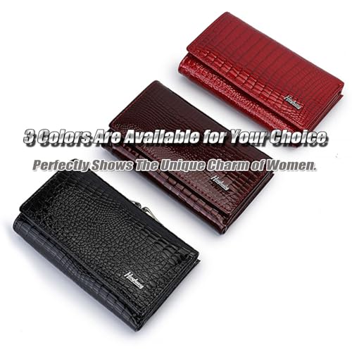 HOT ! Genuine Patent Leather Wallet for Women, Small RFID Blocking Card Holder, Glossy Purse with Crocodile Embossed Texture - 8 Card Slots | ID/Photo Window | Kiss-lock Pocket - Wine Red