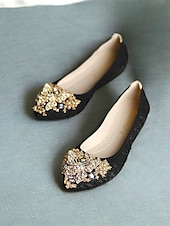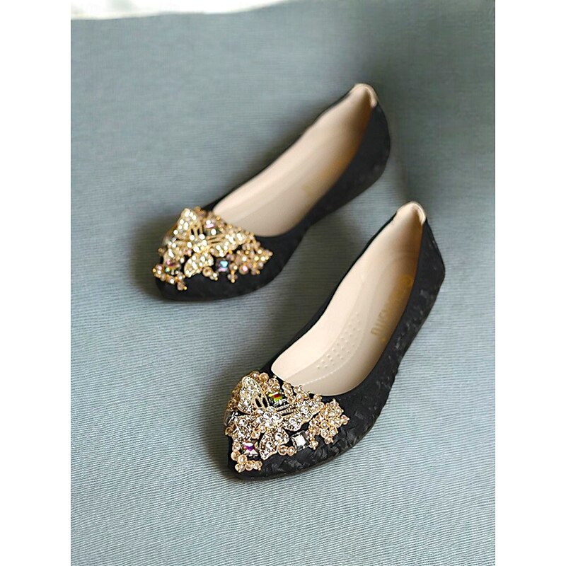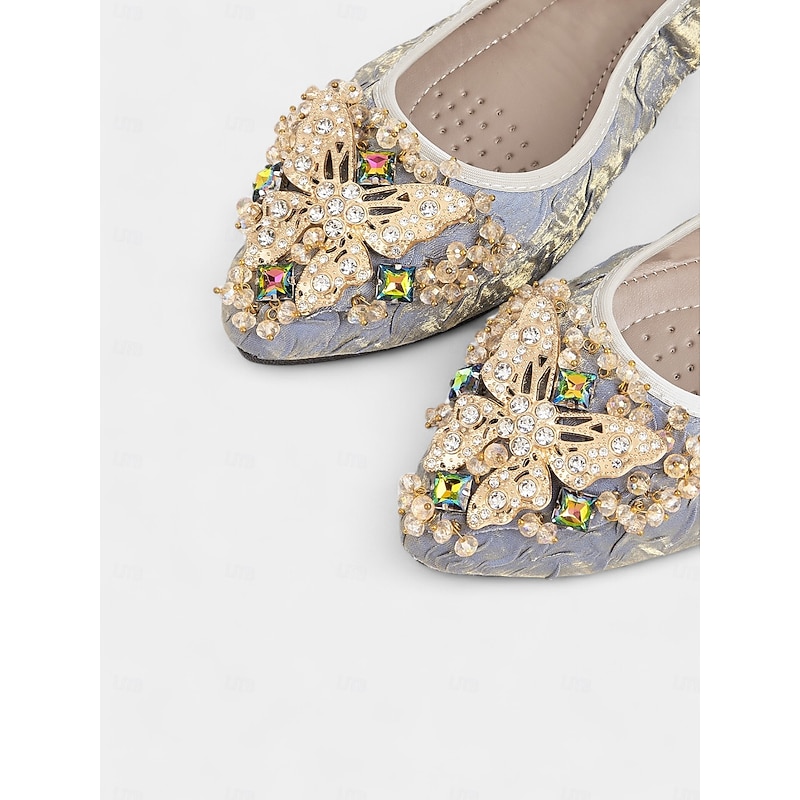 : Showcasing a dazzling beaded butterfly motif on the toe, embellished with rhinestones and crystals, these flats exude glamour and charm. The sparkle of the design enhances their aesthetic, making them a stunning footwear option for special occasions.