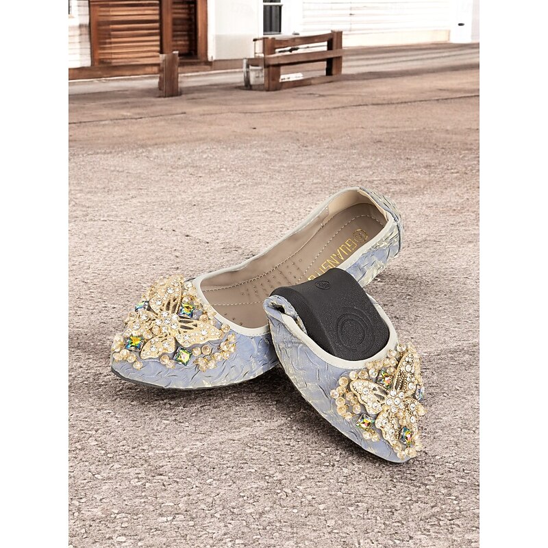 Women's Foldable Embroidered Ballet Flats with Beaded Butterfly Design - Comfortable and Stylish Wedding Shoes