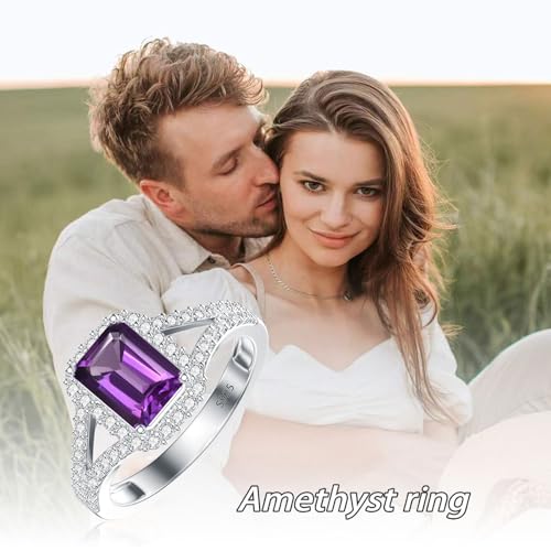 Natural Amethyst Ring 925 Sterling Silver Emerald Cut Purple Gemstone Engagement Ring for Women 7