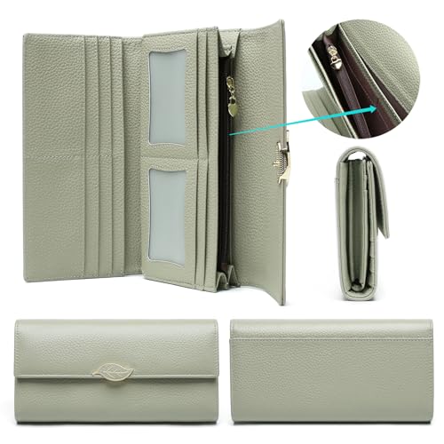 • Large Capacity Womens Wallet: Snap closure. The unique metal leaf design makes this trifold long clutch wallet for women looks cute and stylish. It has 12 card slots, 2 ID/photo windows, 2 cash/phone compartments, 2 receipt/bill/check slots and 1 zipper coin pocket. The zipper coin pocket of this green wallet for women can hold coins, change and multi cards