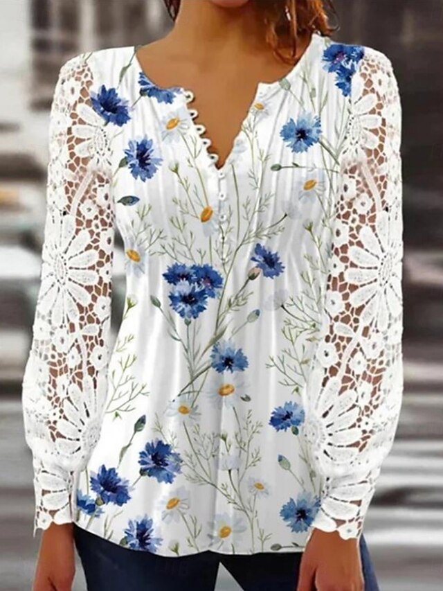 More information about Women's Lace Shirt Blouse Floral Elegant Stylish Basic Long Sleeve V Neck Regular Tops Daily Lace Buttons Print White Blue Sky Blue Purple Spring Fall