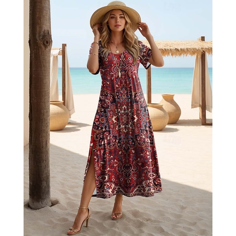 More information about Women's Maxi Dress T Shirt Dress Tee Dress Sundress Shift Dress Bohemia Ethnic Vacation Birthday Holiday Regular Fit Vintage Short Sleeve Crew Neck Red Blue Green Dark Blue