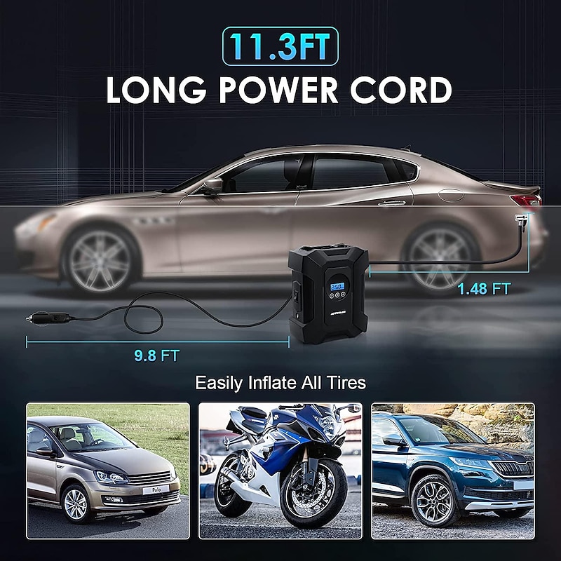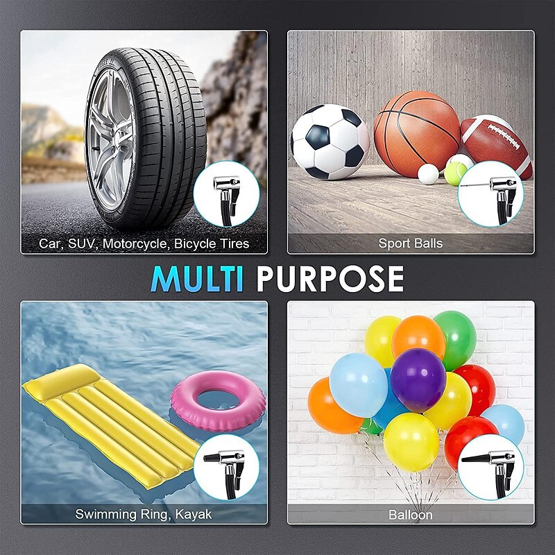 - MULTI-PURPOSE: This tire inflator is not only suitable for compact or midsize Sedan, SUV, ATV, and motorcycle tires but also includes three nozzle attachments for inflating sports balls, air mattresses, pool toys, and other inflatables. It can also be used as a bike air pump.