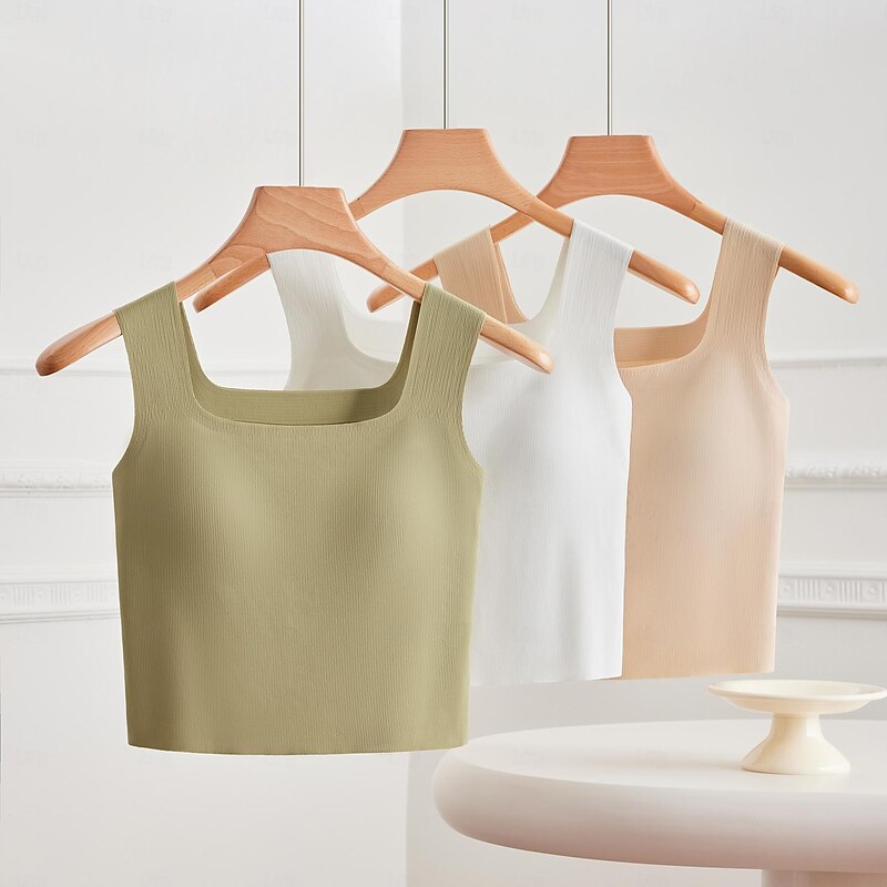 Highlights [Fabric:] Crafted from a soft polyester blend, these tank tops deliver a breathable and comfortable experience during summer. The micro-elastic fabric ensures a snug fit while allowing for easy movement. [Fit and Style:] Featuring a regular fit, the tank tops include wide straps and a classic square neckline, providing a modern and stylish silhouette. The ribbed texture adds sophistication and a slight stretch for a comfortable wear. [Design Highlights:] Each tank top is thoughtfully designed with built-in chest pads, allowing it to be worn without additional undergarments. This functional detail enhances comfort and convenience, making it suitable for layering or wearing on its own. [Occasions:] Ideal for hot summer days, these tank tops are perfect for casual outings, beach trips, or relaxed weekend gatherings. Their versatile colors and stylish design make them a staple addition to any summer wardrobe. [Size Range:] Available in sizes M, L, and XL, these tops cater to a variety of body types, ensuring a comfortable fit for most women. With colors like blue, green, white, black, and beige, there's an option to suit every taste.