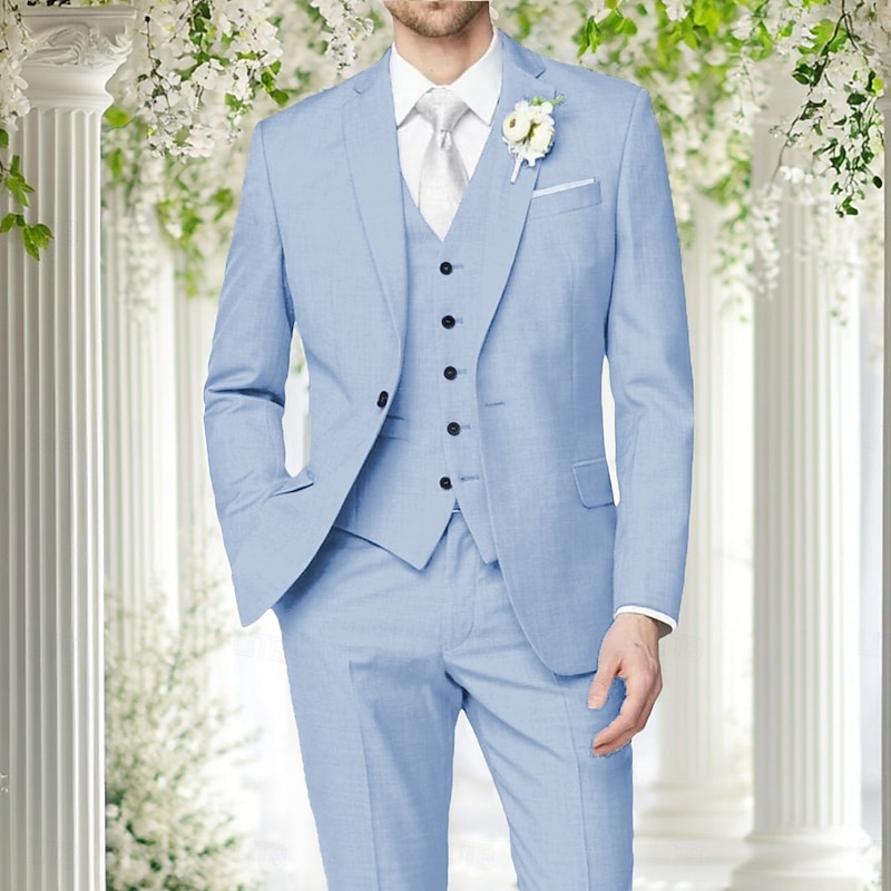 More information about Men's Wedding Linen Suits Notch Lapel Dark Khaki Sky Blue Formal Solid Colored Tailored Fit 3 Piece Single Breasted One-button
