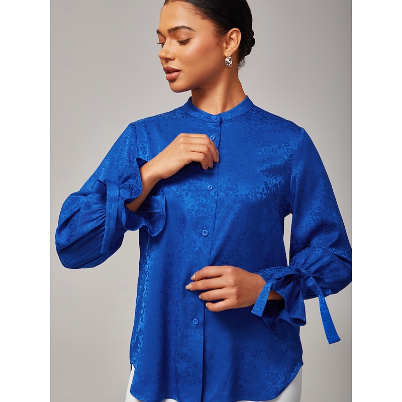 Women's Royal Blue Satin Shirt Subtle Jacquard Lustrous Satin Mini Stand Collar Bow Tie Strap Elegant Stylish Daily Work Fall 1