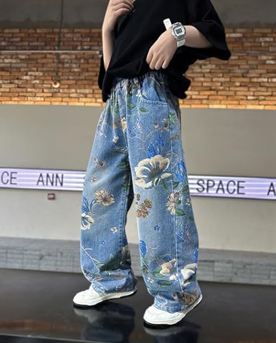 HOT ! Boys Baggy Flower Printed Jeans Elastic Waist Casual Straight Wide Leg Pull On Hip Hop Denim Pants Streetwear