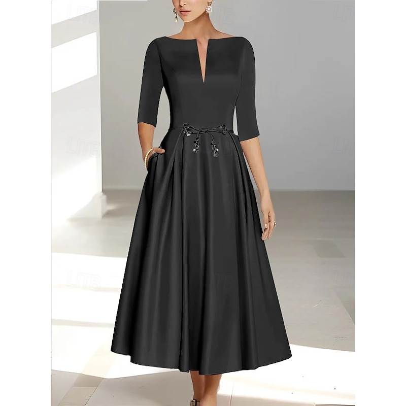 HOT ! A-Line Cocktail Dresses Elegant Dress Formal Wedding Guest Ankle Length Short Sleeve Illusion Neck Pocket Satin with Bow(s)