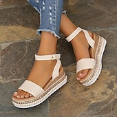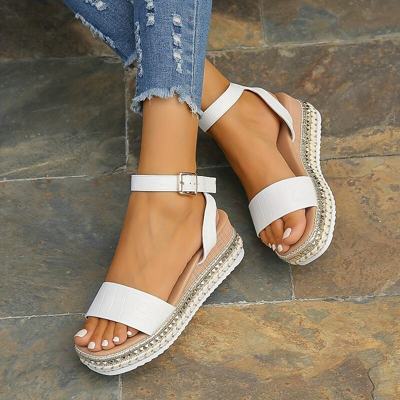Highlights [Fabric & Material] These chic women's platform wedge sandals are crafted with high-quality PU, giving them a sleek and stylish faux leather appearance with an appealing crocodile texture. The material choice ensures a durable yet fashionable look that's perfect for summer outings. [Design & Style Highlights] The sandals boast a sophisticated wedge and platform heel design that offers both height and comfort. Featuring a double-strap construction, they elegantly secure the toes and ankle, with adjustable straps fastened by a metallic buckle for a secure fit. The sole's braided jute accents add a touch of bohemian charm, while the thick white EVA outsole ensures stability and grip. [Versatile Occasions] Ideal for beach trips, outdoor adventures, or casual vacations, these sandals are a versatile addition to any summer wardrobe. Their elegant yet relaxed style makes them suitable for a range of events, whether you're enjoying a sunny day out or a casual evening gathering. [Design Features] Emphasizing a modern aesthetic, these sandals come with a stylish open-toe design and a mid-heel height that complements various outfits. The refined ankle strap incorporates metallic elements, adding a polished yet practical aspect to the footwear. [Size Range & Fit] Available in a variety of sizes from US6 to US10.5, with equivalents in EU and UK sizes, these sandals cater to a broad range of foot sizes. Please consult the size chart provided by the supplier to ensure the perfect fit for your individual needs.