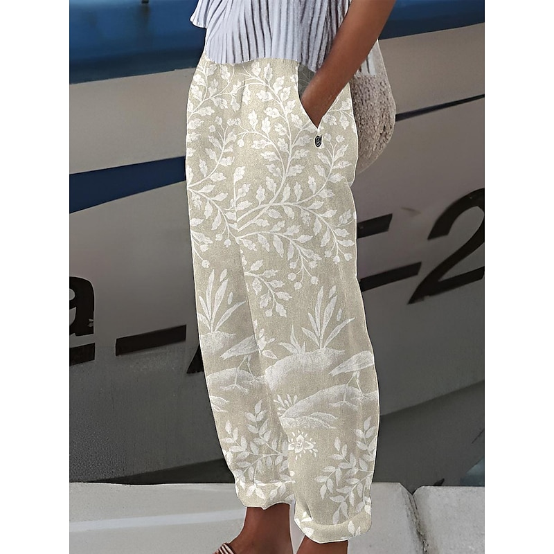 HOT ! Women's Cotton Linen Pants Baggy Pants Linen Like Casual Comfort Full Length Mid Waist Plants Print Comfy Breathable Micro-elastic Light Yellow Light Pink Buff Transparent Blue Summer Spring Fall