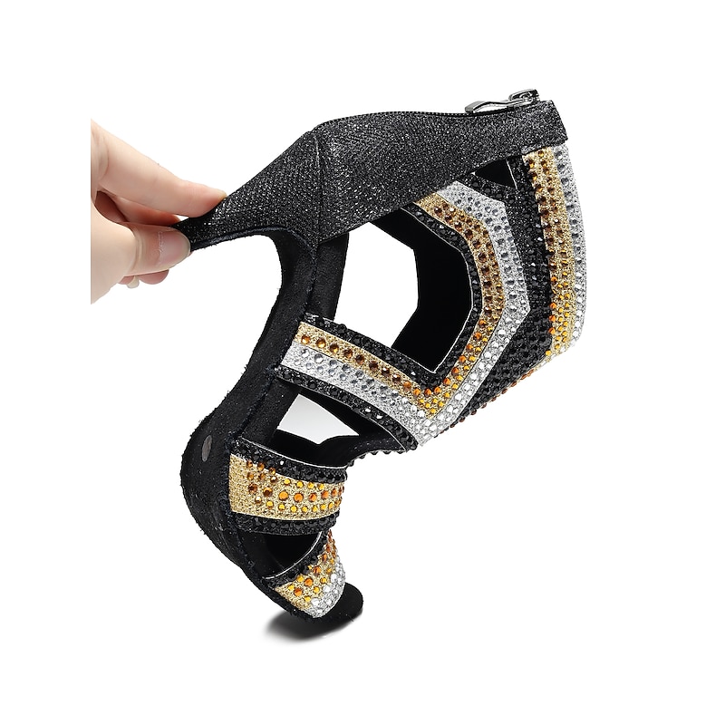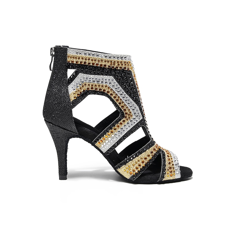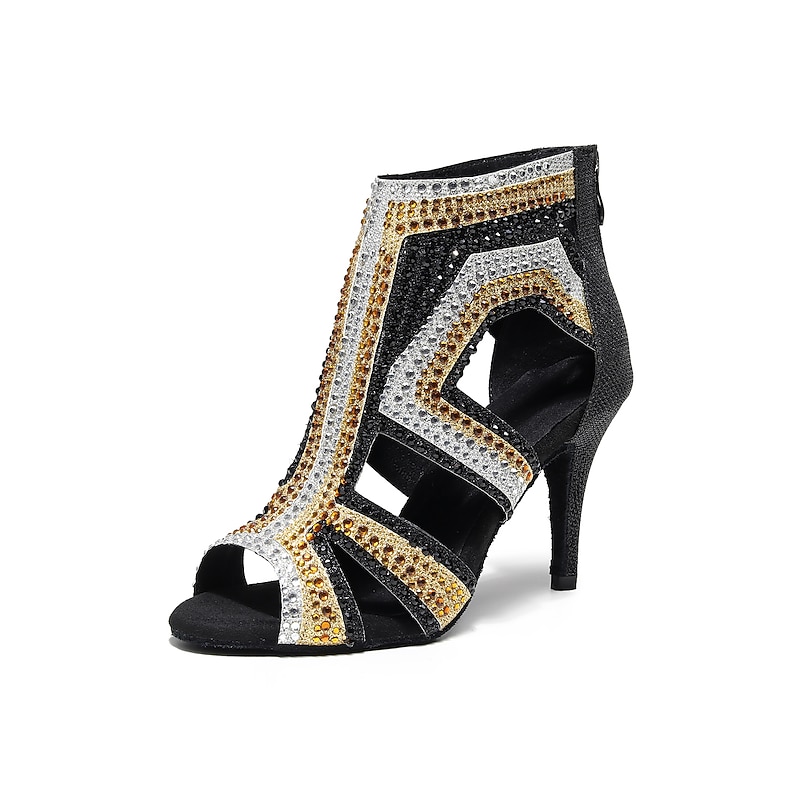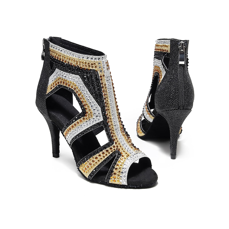 Highlights [Fabric] : Crafted from premium PU leather, these women's dance boots offer a sleek and luxurious feel while ensuring durability and comfort during performances or long training sessions. The material provides flexibility and support, which is essential for dynamic dance movements. [Silhouette] : Featuring a sophisticated ankle boot design, these salsa dance shoes integrate the timeless appeal of tango shoes with a modern twist. The slim high heel provides an elegant lift, enhancing the silhouette while maintaining a stable base for confident dance steps. [Design Highlights] : The standout feature of these shoes is the intricate rhinestone embellishments in dazzling gold and black hues, creating captivating geometric patterns across the upper. The sided hollow-out design and chic peep toe add a modern flair. A practical back zipper and additional lace-up closure ensure a secure fit and ease of wear. [Occasions] : Perfectly suited for performance and training, these dance boots are ideal for salsa, tango, or any other dance practice. Their eye-catching design also makes them a fitting choice for evening events and special occasions where you wish to make a bold style statement. [Size Notice] : These women's dance boots are available in a range of sizes from US4 to US11, accommodating various foot dimensions. For an optimal fit, it is advised to select one size larger than your usual size.