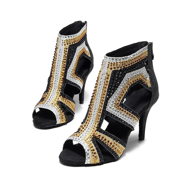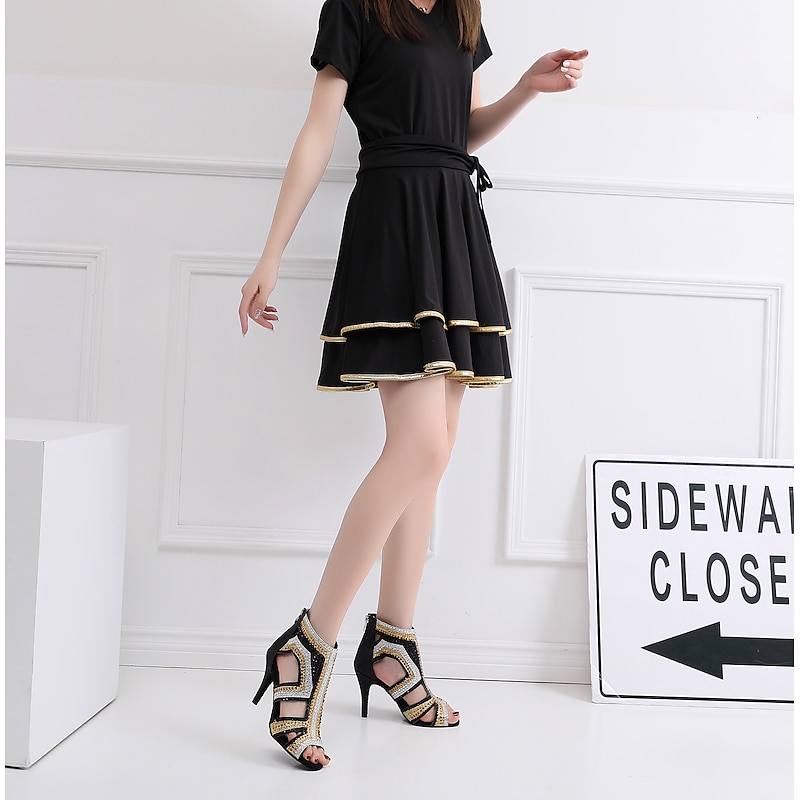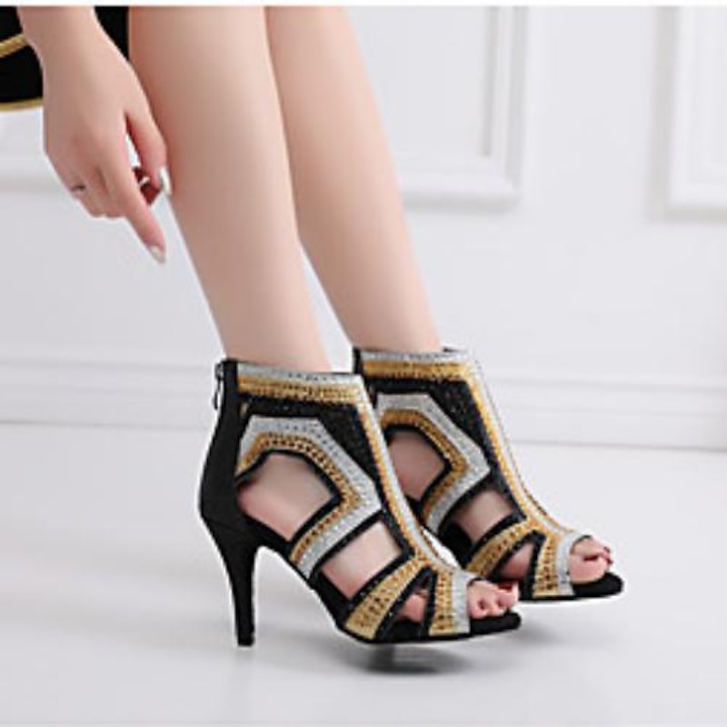 More information about Women's Salsa Shoes Dance Boots Tango Shoes Performance Training Ankle Boots Heel Crystal / Rhinestone Sided Hollow Out Slim High Heel Peep Toe Zipper Lace-up Adults' Black / Gold