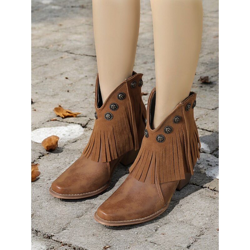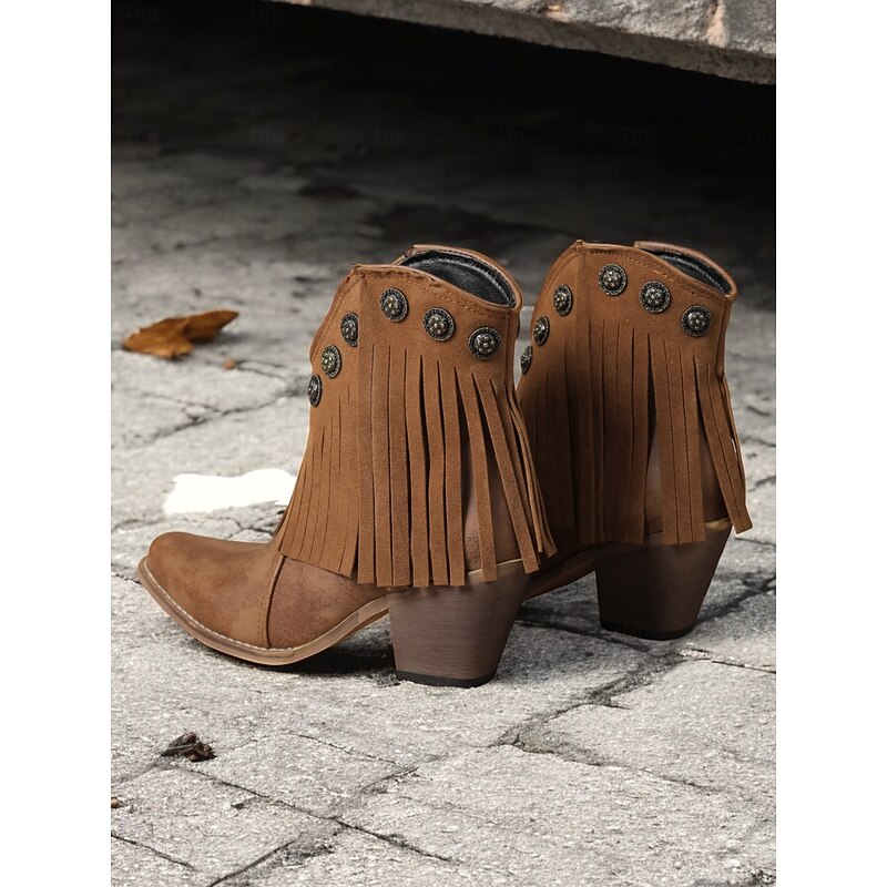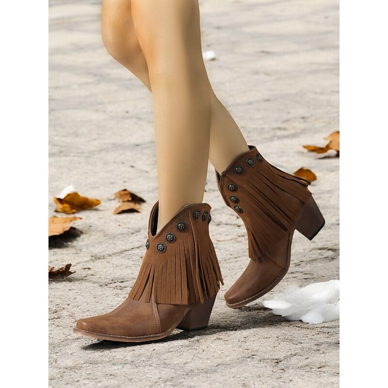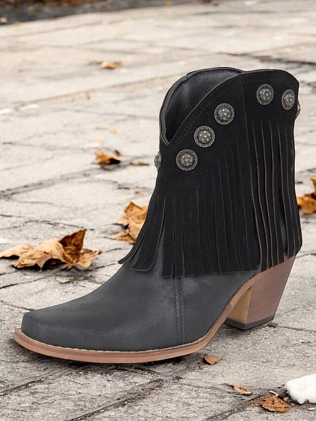 Highlights [Fabric] These Women's Black Fringe Western Ankle Boots are crafted from high-quality PU leather, providing a durable and sophisticated finish. The synthetic leather and textile lining materials add comfort and longevity, making these boots a great choice for both style and wearability across multiple seasons including spring, fall, and winter. [Fit] With a mid-height chunky heel, these boots offer both stability and comfort, making them suitable for a variety of occasions. The square toe shape provides a modern touch to the vintage cowgirl booties, enhancing both comfort and style for all-day wear. [Design Highlights] A standout feature of these boots is the decorative leather fringe that cascades from the top, offering a bohemian elegance. Additionally, the ornamental metal studs along the upper part add a touch of rustic charm, while the loafer closure type adds convenience to the design. [Occasions] Perfect for daily wear, work, casual outings, and festival wear, these boots seamlessly blend Western-inspired style with contemporary fashion. They are an excellent choice for both casual and semi-formal settings. [Size Notice] These boots are available in a range of sizes to suit your needs, from US5.5 to US10.5, ensuring you find the perfect fit. Designed to fit standard size guidelines, it's recommended to select your usual size for the best fit.