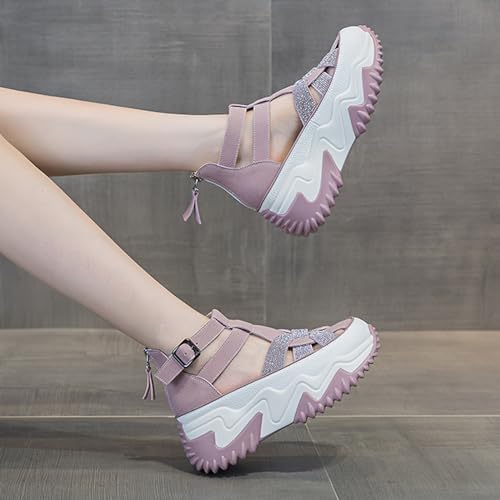 Women Rhinestone Thick-Soled Fashion Sneakers,Hollow Back Zipper Heightening Shoes Comfortable Adjustable Buckle Breathable Casual Platform Sneakers Sandals 6