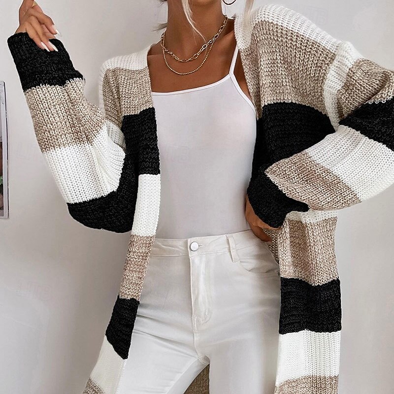 Highlights [Fabric] This women's cardigan is crafted from a soft, knitted fabric, ensuring warmth and comfort during the cooler seasons. The micro-elastic quality of the material allows for easy movement and a comfortable fit. [Fit] Featuring a loose fit, this cardigan offers relaxed wearability that's perfect for layering. The open-front design enhances its versatility, making it easy to pair with different outfits for various occasions. [Design Highlights] The cardigan showcases a chic color-block design with horizontal stripes in black, beige, and white, creating a trendy and eye-catching appearance. Ribbed edges on the cuffs and hem add subtle texture, while the long sleeves provide ample coverage for added warmth. [Occasions] Ideal for work, casual outings, or everyday wear, this cardigan can be effortlessly styled over a simple top and jeans for a laid-back look, or accessorized for a more polished ensemble. Its blend of comfort and fashion makes it suitable for various daily activities and settings. [Size Range] Available in sizes S, M, L, and XL, this cardigan offers a range of sizing options to ensure a suitable fit for different body types.