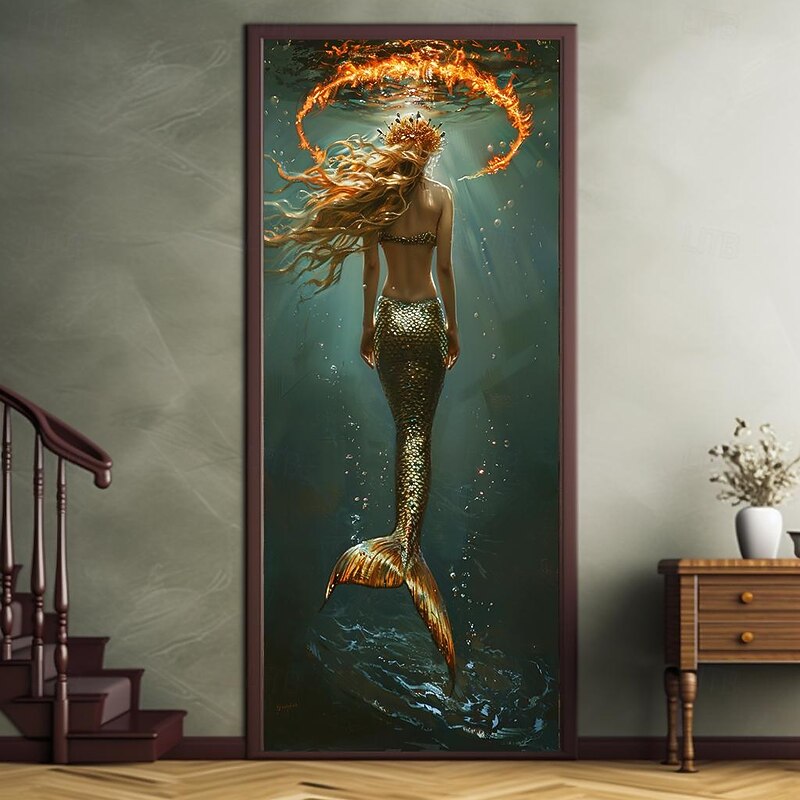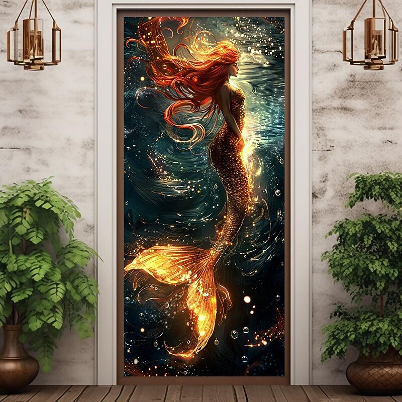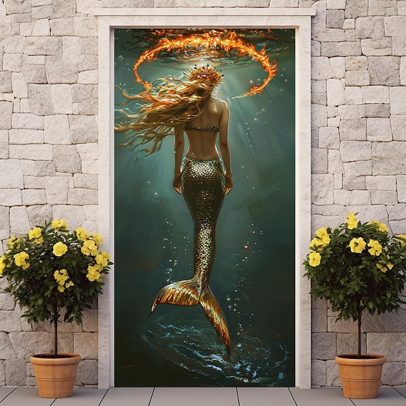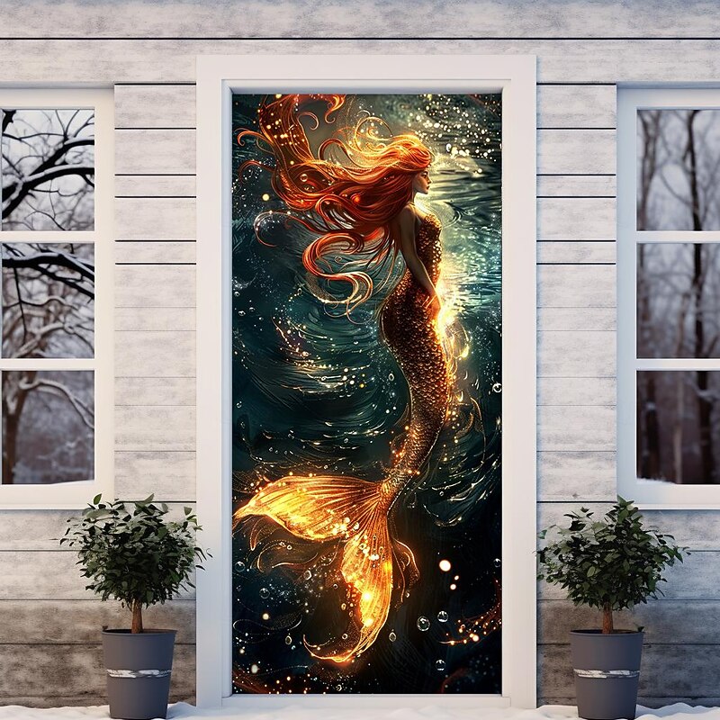 HOT ! Mermaid Halo Door Covers Mural Decor Door Tapestry Door Curtain Decoration Backdrop Door Banner Removable for Front Door Indoor Outdoor Home Room Decoration Farmhouse Decor Supplies