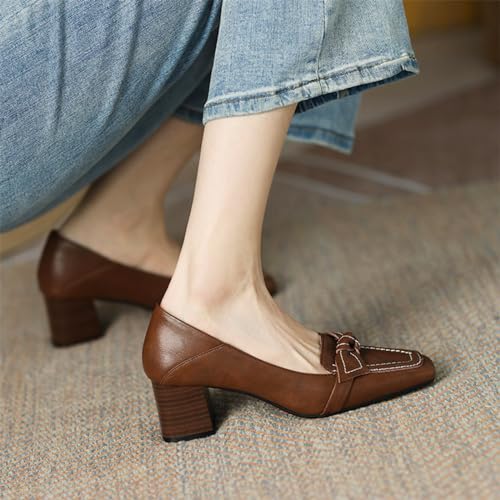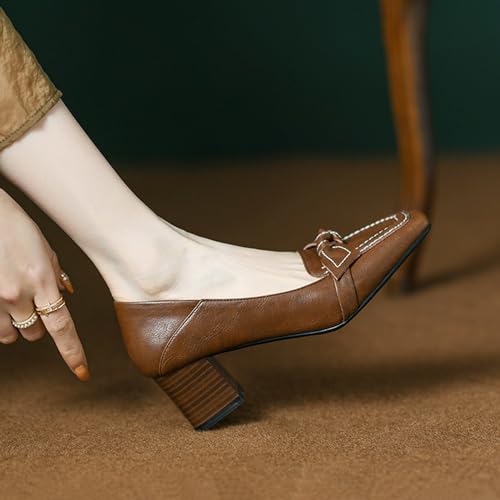 HOT ! Women's Retro Leather Bow Tie Chunky Heel Pumps Shoes Slip On Classic Comfortable Square-Toe Loafers Dress Shoes Business Party Wedding Shoes