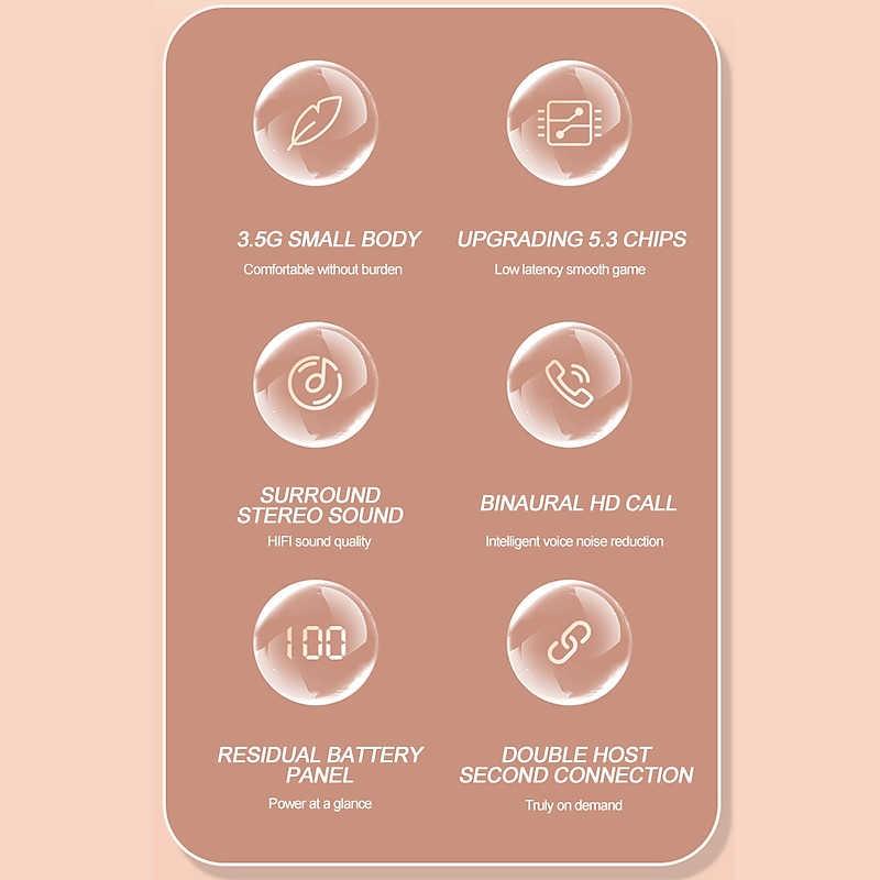 Highlights Product Name: Mini Bluetooth Headphones - Bluetooth Version: Bluetooth 5.3 - Enables seamless connectivity with any Bluetooth-enabled device. - Transmission Distance: About 10m - Enjoy wireless freedom within a 10-meter range. - Long Standby Time: 45h - Extended battery life ensures uninterrupted usage for up to 45 hours. - Features 1: Intelligent Touch Control - Effortlessly manage your headphones with intuitive touch controls. - Features 2: Intelligent Noise Reduction - Experience crystal-clear audio without any interference from background noise. - Features 3: Waterproof and Sweatproof - Designed to withstand moisture and sweat, making them perfect for workouts or outdoor activities. - Features 4: HiFi Stereo - Enjoy immersive and high-fidelity stereo sound for an enhanced audio experience. - Features 5: HD Call - Make or receive calls with exceptional clarity and voice quality. - Features 6: Power Display - Easily monitor the battery level of your headphones with the digital screen display. - Features 7: Voice Assistant - Access your smartphone's voice assistant feature for convenient hands-free control. - Features 8: Transmission Without Delay - Experience fast and lag-free audio transmission without any delays. - 1.3.5g small body comfortable without burden - Lightweight and compact design provides a comfortable fit without causing any discomfort. - HiFi sound quality with surround stereo sound effect - Immerse yourself in high-quality audio with a surround sound experience. - Upgrade Bluetooth 5.3 chip low latency smooth game - Enjoy a smooth gaming experience with low latency thanks to the upgraded Bluetooth 5.3 chip. - Intelligent voice noise reduction for binaural high-definition call - Clear and high-definition call quality with intelligent voice noise reduction technology. - Digital screen display of charging chamber power - Conveniently check the power remaining in the charging chamber with the digital screen display. - Dual hos