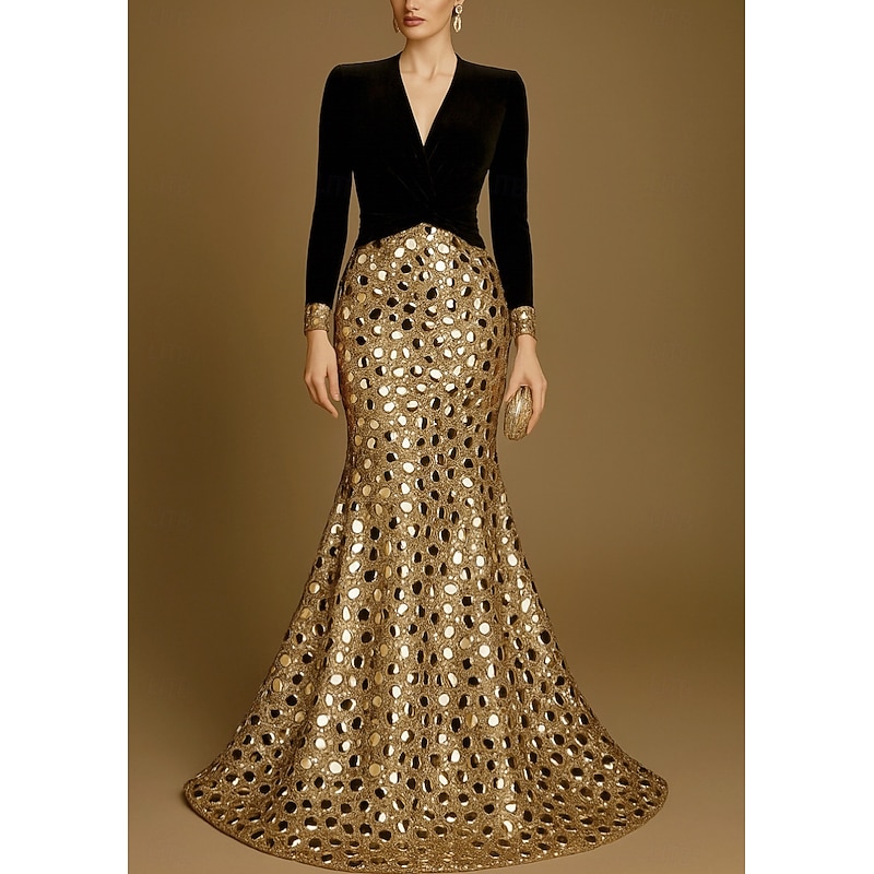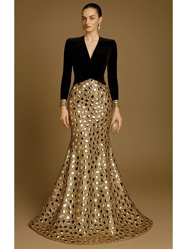HOT ! Black Gold Mermaid / Trumpet Evening Gown Elegant Formal Dress Formal Wedding Floor Length Long Sleeve V Neck Sequined with Glitter Pleats Sequin 2025