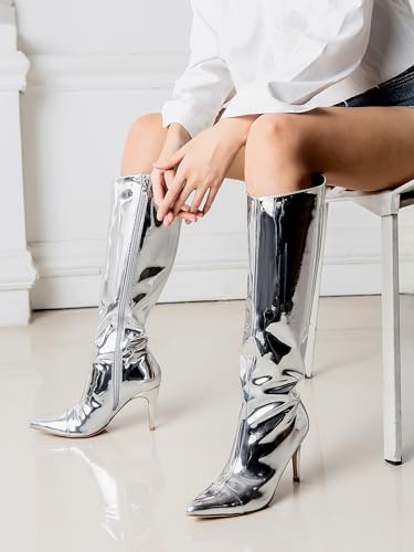 Shoe'N Tale Women's Knee High Boots Pointed Toe Stiletto High Heel Metallic Party Dressy Slip-on Booties Shoes 4