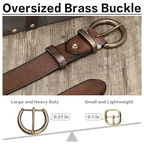 • ✔ 【Trendy Vintage Style】- This 1.5" wide leather belt with a large brass buckle adds a stylish, retro touch to any outfit, perfect for jeans and casual wear.