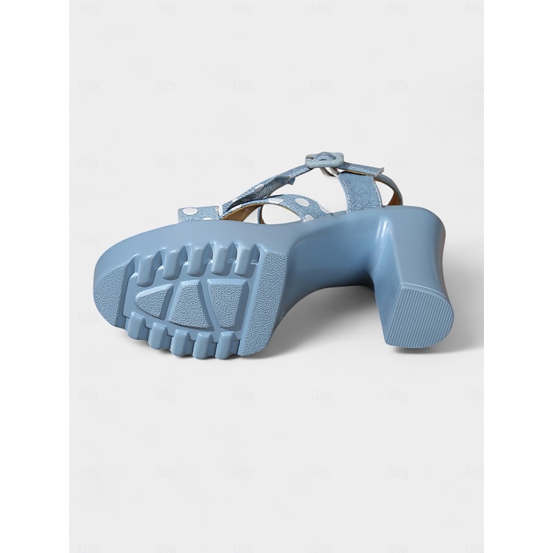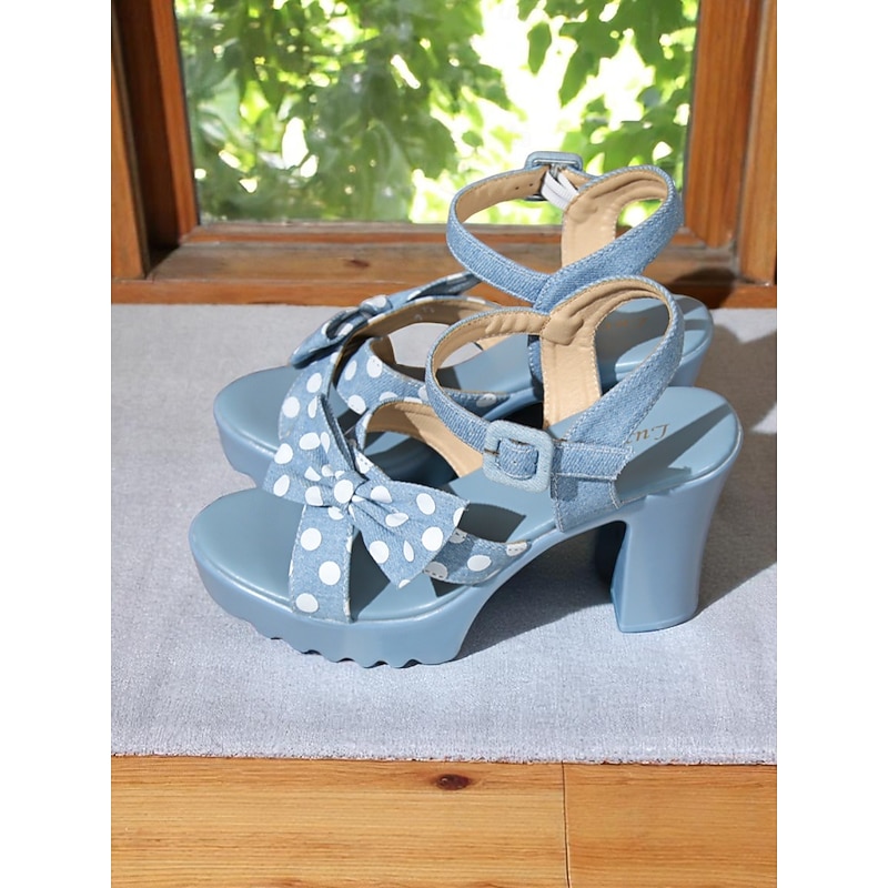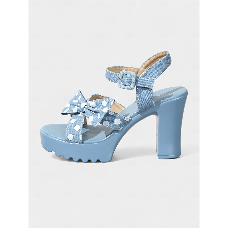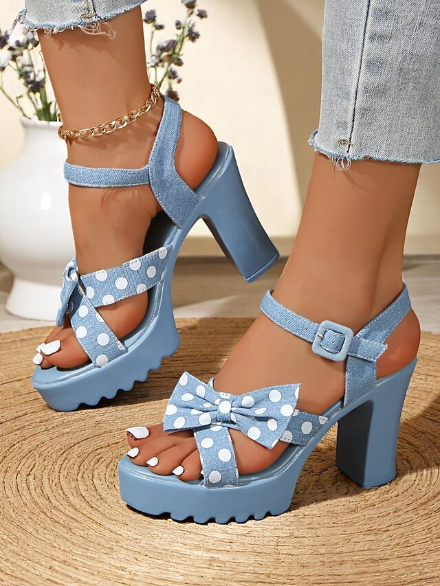 HOT ! Women's Light Blue Polka Dot High Heel Sandals with Bows Retro Chunky Platform Summer Shoes for Parties, Dates, and Vacation Outfits