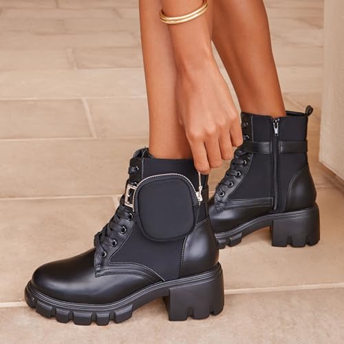 • Versatile & Stylish : The Lace-up combat boots features a chunky lug-sole platform and a signature accent pocket., making it the perfect outdoor casual and stylish womens ankle boots for every occasion.
