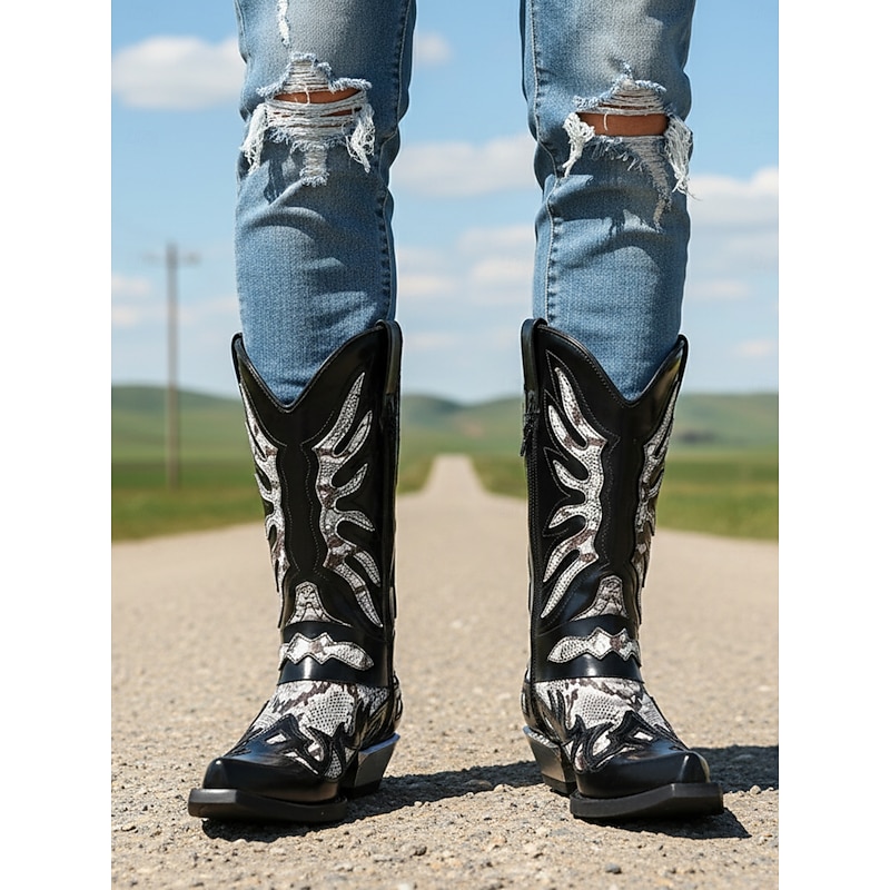Men's Gothic Cowboy Boots - Black and Silver Snakeskin Faux Leather Western Boots with Flame Cutout Design and Metal Heel for Rock, Biker, and Party Events 1