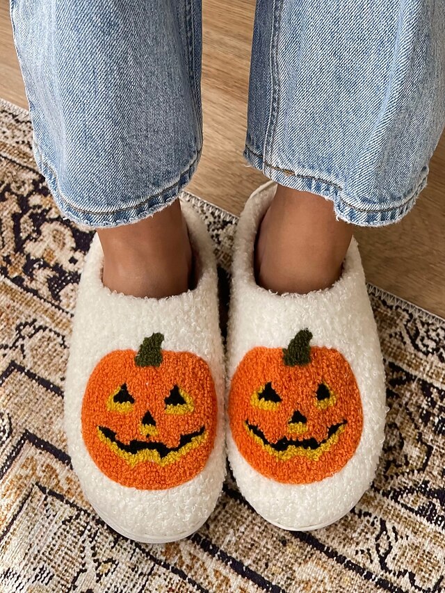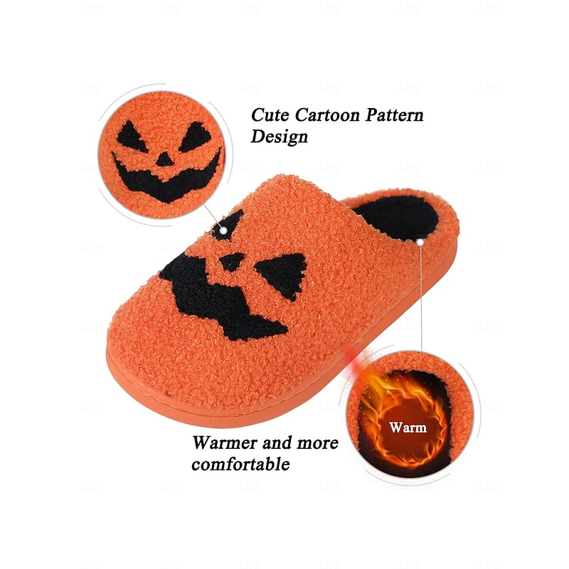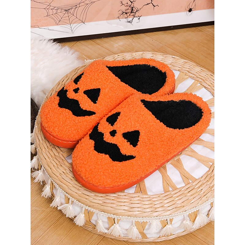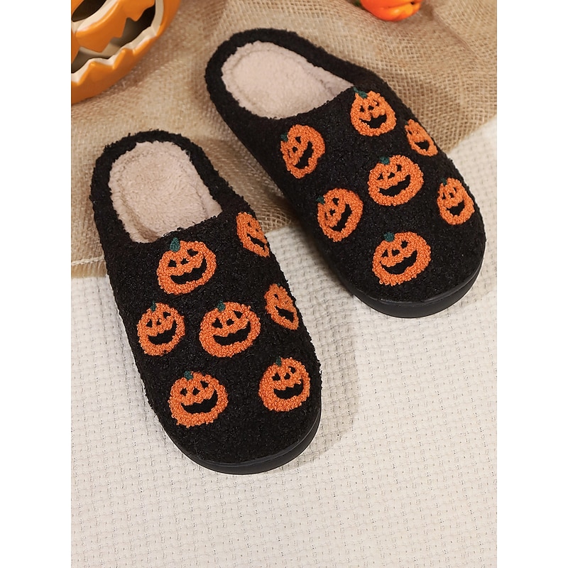 Halloween-Themed Cozy Fleece Slippers for Women with Pumpkin and Skull Patterns – Fun Indoor Footwear for Fall and Halloween Parties 24