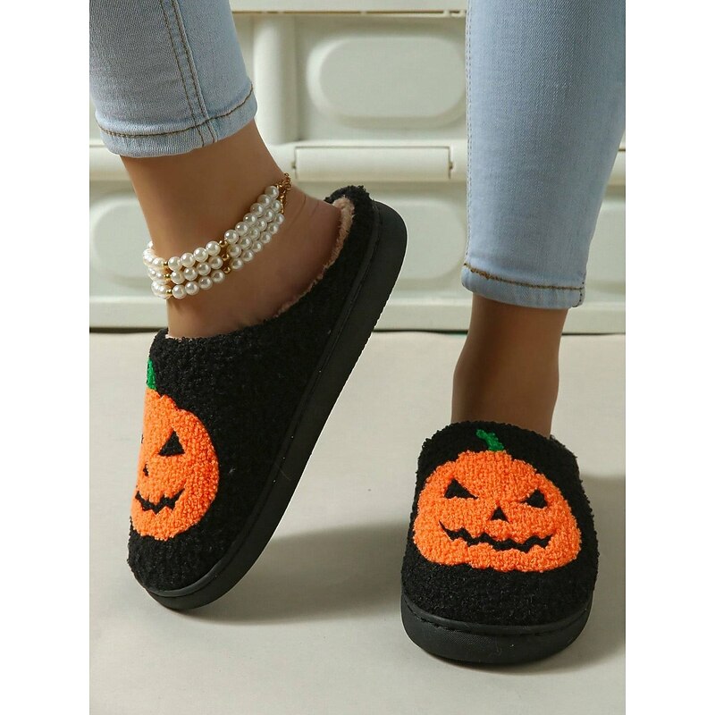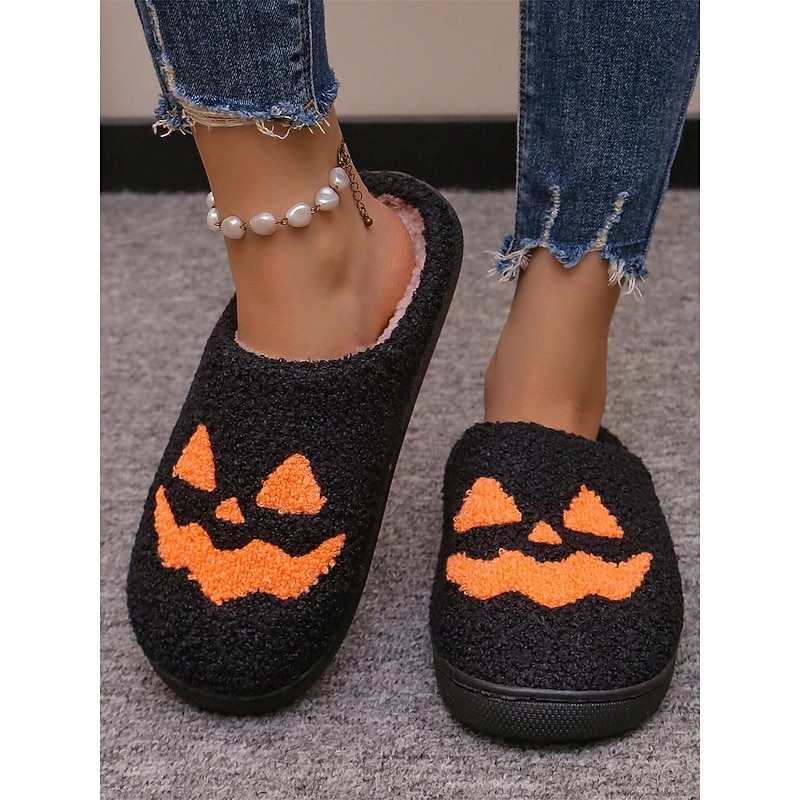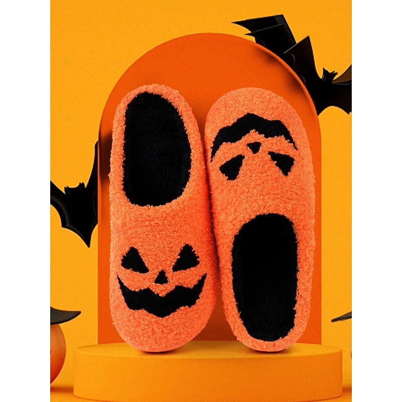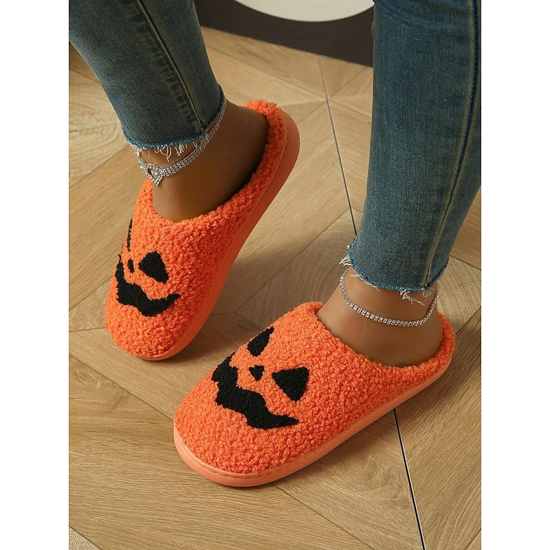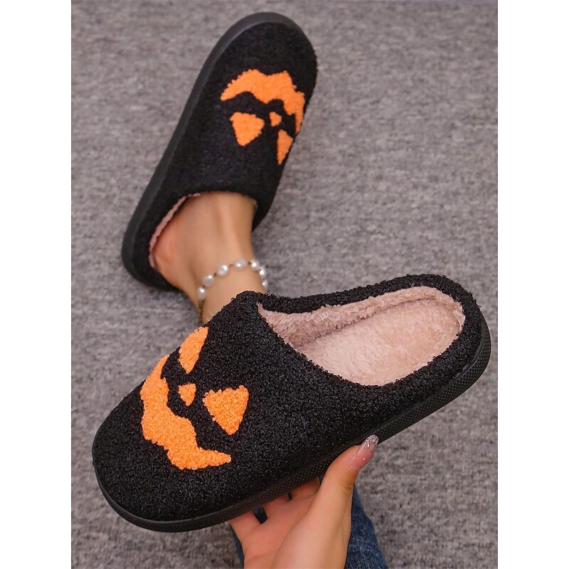 HOT ! Halloween-Themed Cozy Fleece Slippers for Women with Pumpkin and Skull Patterns – Fun Indoor Footwear for Fall and Halloween Parties