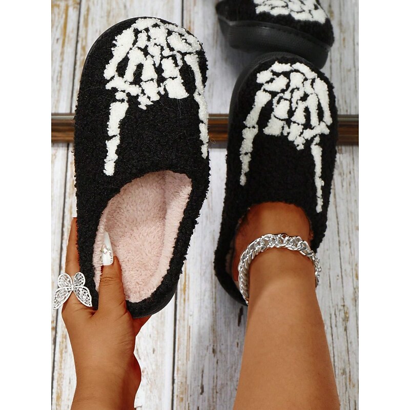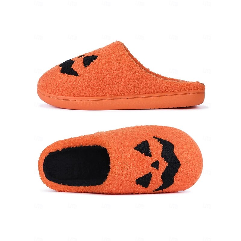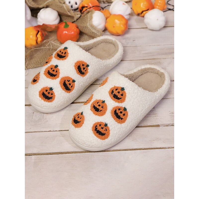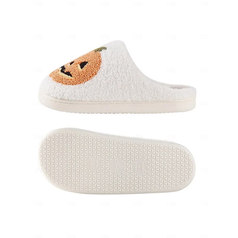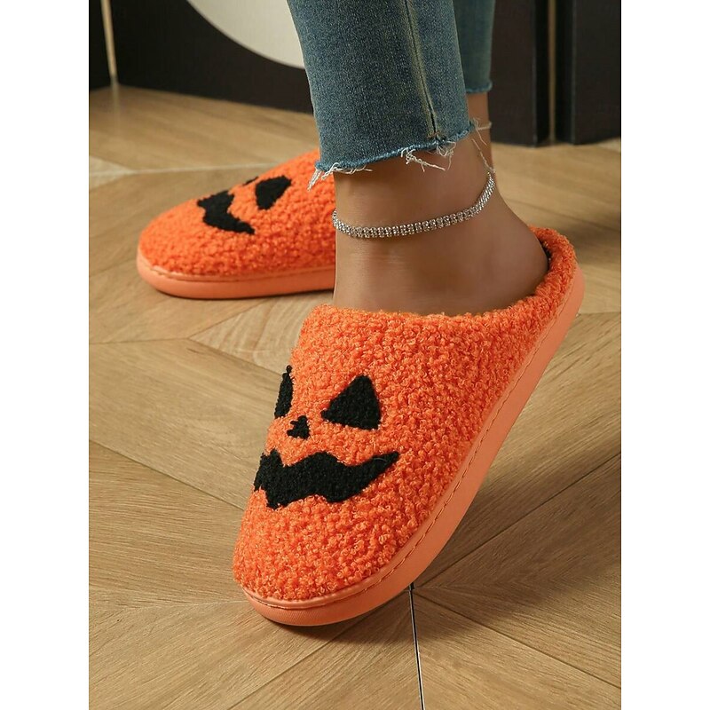 HOT ! Halloween-Themed Cozy Fleece Slippers for Women with Pumpkin and Skull Patterns – Fun Indoor Footwear for Fall and Halloween Parties