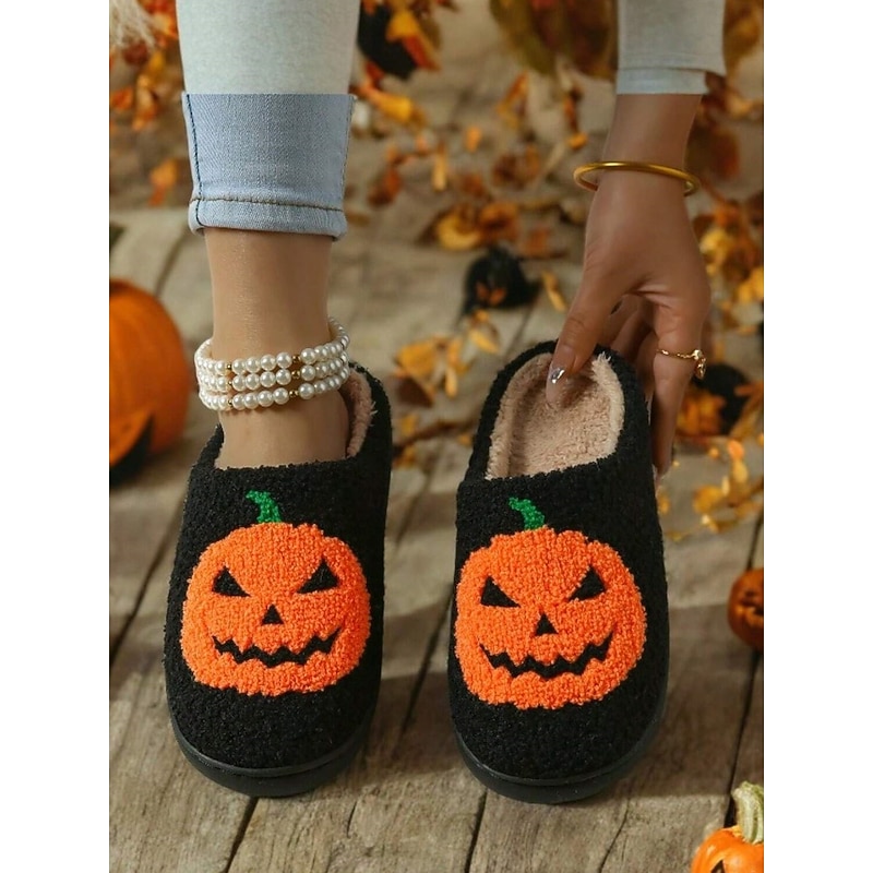 Halloween-Themed Cozy Fleece Slippers for Women with Pumpkin and Skull Patterns – Fun Indoor Footwear for Fall and Halloween Parties 17