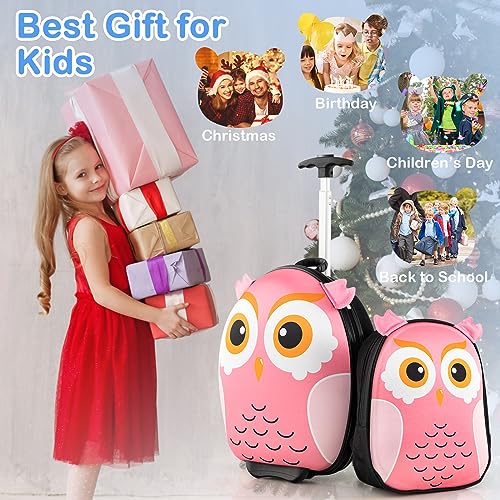 BABY JOY 2 Pcs Kids Luggage Set, 16" Rolling Suitcase w/ 12" Backpack, Airline Approved for Girls & Boys Children Toddlers, Kids Carry On Luggage with Wheels (Owl) 2